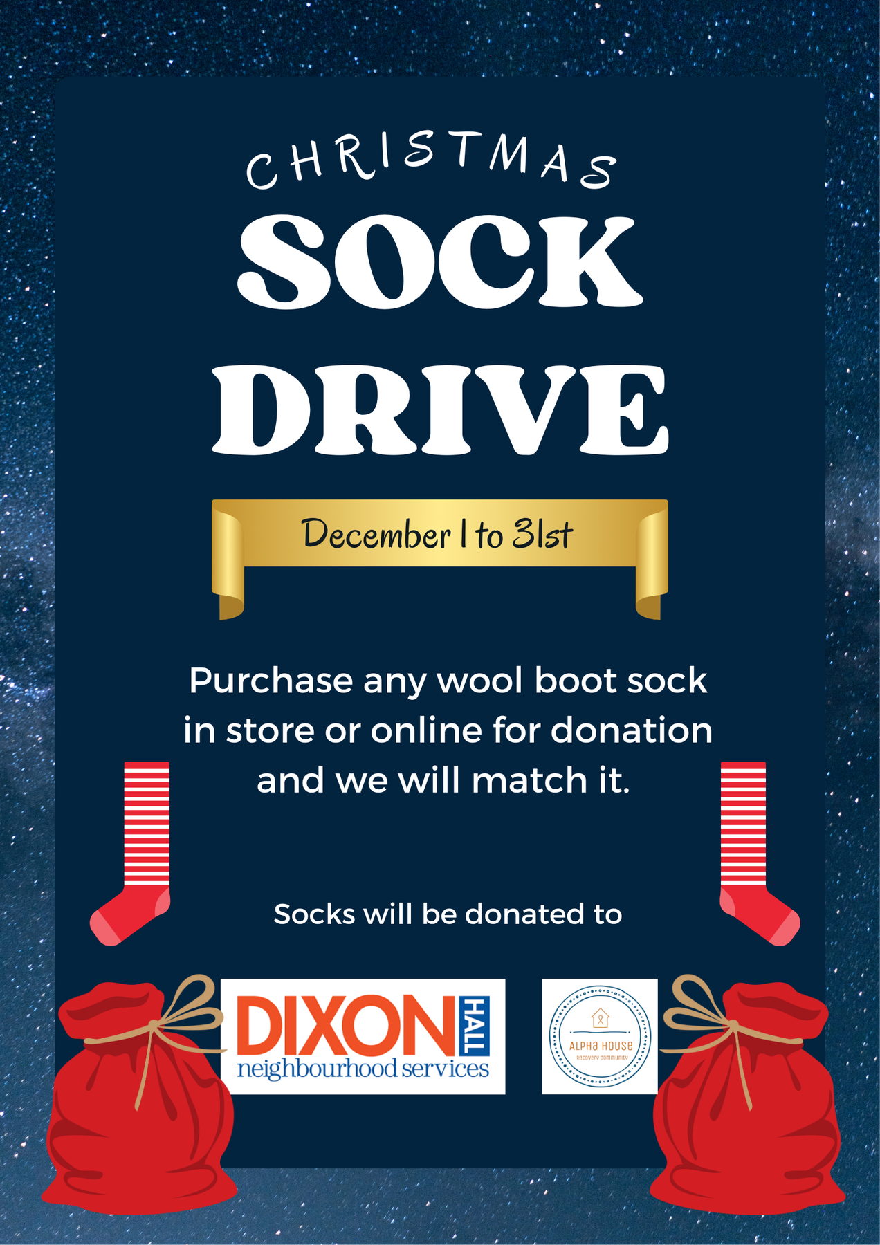 Aidez-nous à faire don de chaussettes lors de notre collecte annuelle de chaussettes. Les chaussettes sont l’un des articles les plus nécessaires pour les personnes sans abri ou en situation de précarité en matière de logement, en particulier pendant les mois froids de l’hiver. Toutes les chaussettes seront envoyées à Dixon Hall, où elles seront distribuées aux clients du service du logement de la région de l’est de Toronto.